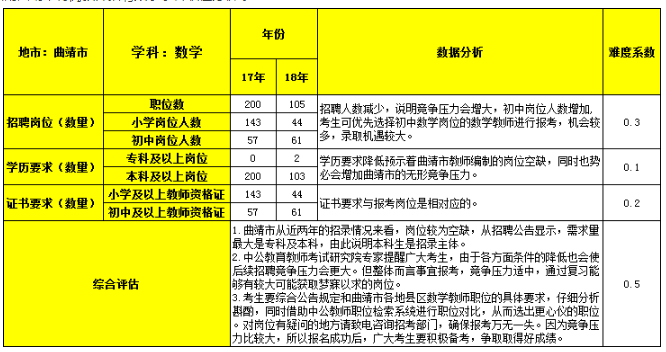 2018年云南曲靖市特岗教师 数学 学科职位分析