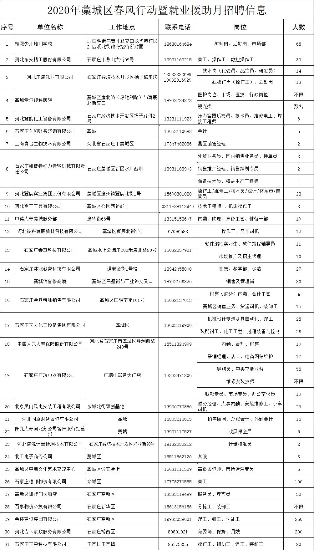 “石家庄市藁城区2020年春风行动暨就业援助月网络招聘会”. 本次招聘会的主题是“春风送真情,就业暖民心”.活动时间:2020年2月4日至2020年3月31日...