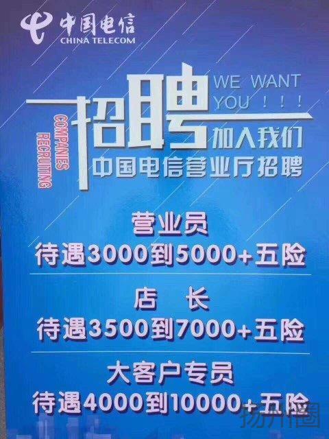 扬州电信招大客户经理,营业员,薪资3000 10000 五险