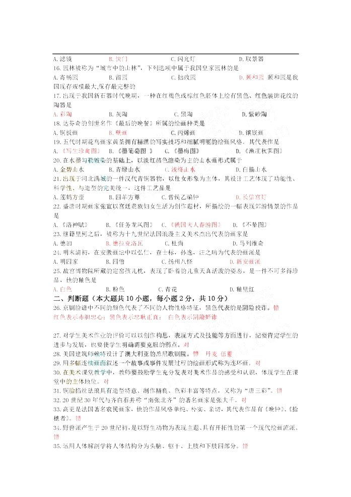 2017江西教师招聘考试小学美术真题及答案 Word版