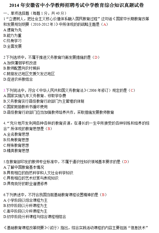 2014年安徽省中学教师招聘考试教育综合知识笔试真题试卷